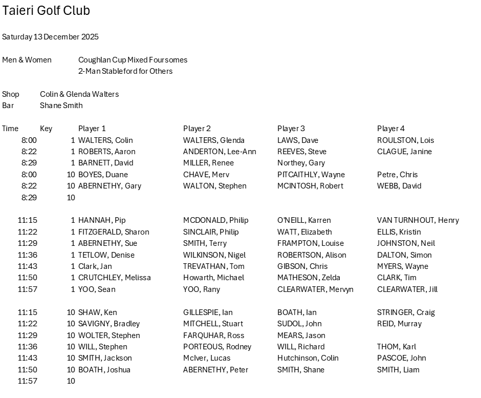 Draw – Taieri Open Round 1 – Saturday 6th December