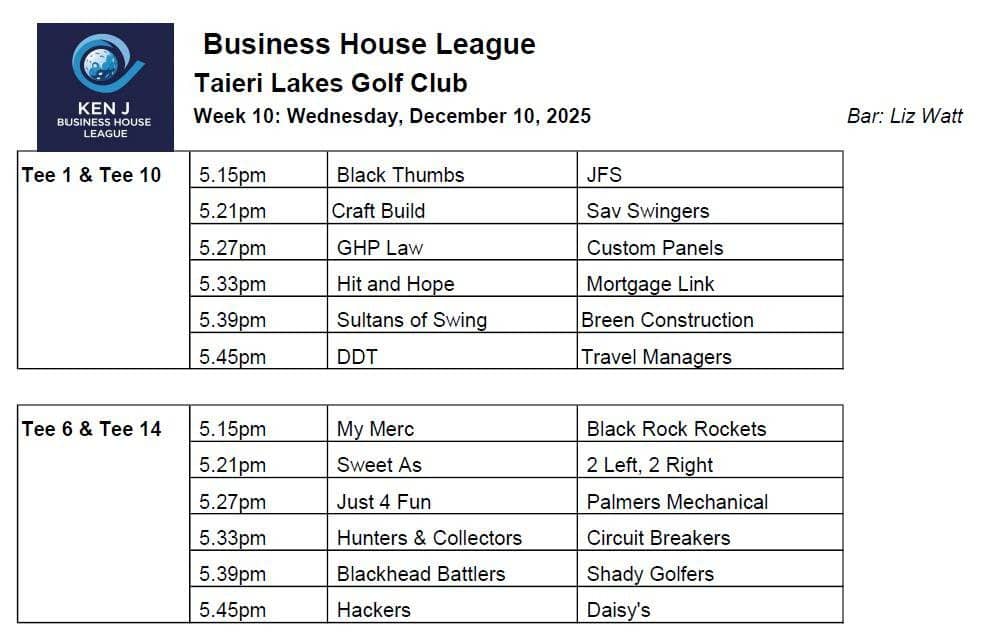 Draw – Taieri Open Round 2 – Sunday 7th December
